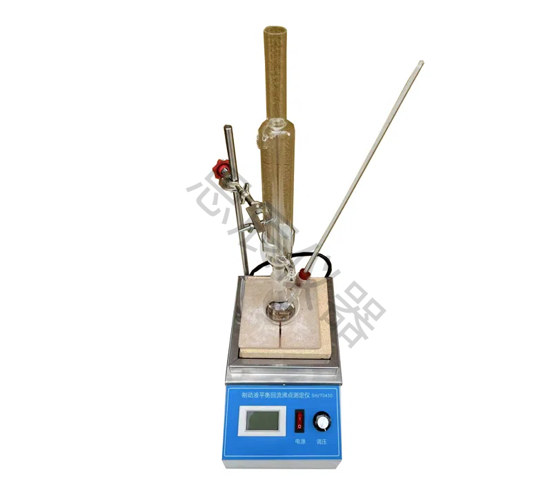 本儀器是根據石化行業標準SH/T0430《剎車液平衡回流沸點測定法》而設計生產的,由電子調壓器、圓形大功率電爐加熱器、沸點燒瓶及冷凝管等組成.儀器的方法為,取一定量的試樣在燒瓶內與大氣壓平衡,并在一定回流速度條件下沸騰,用矯正到標準大氣壓的溫度作為平衡回流的沸點。